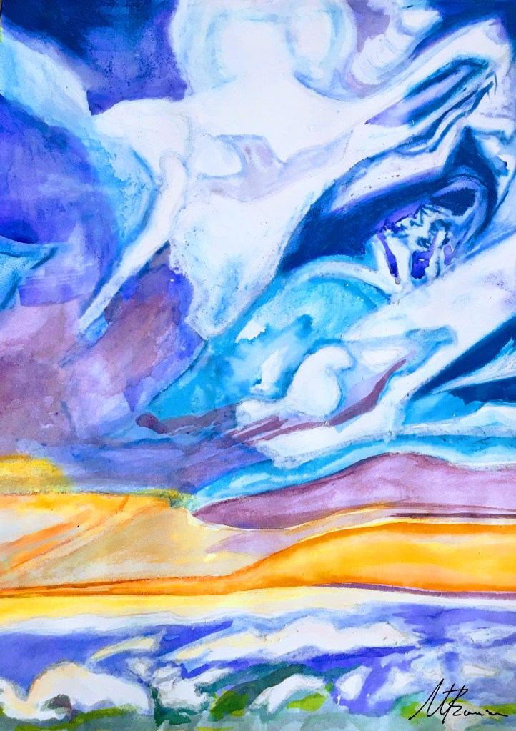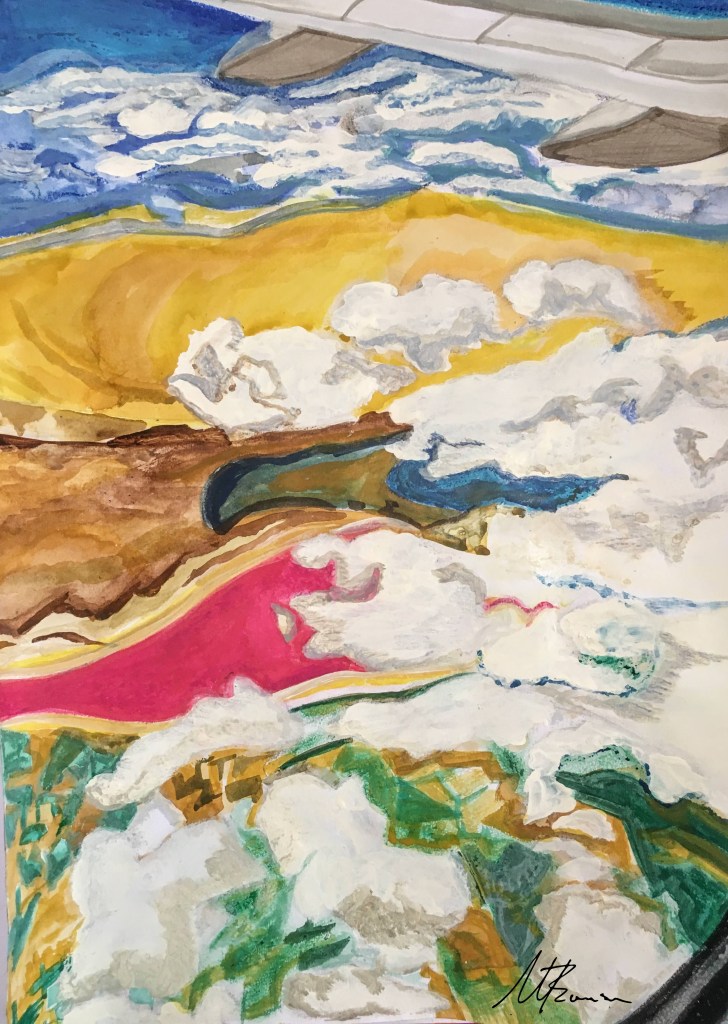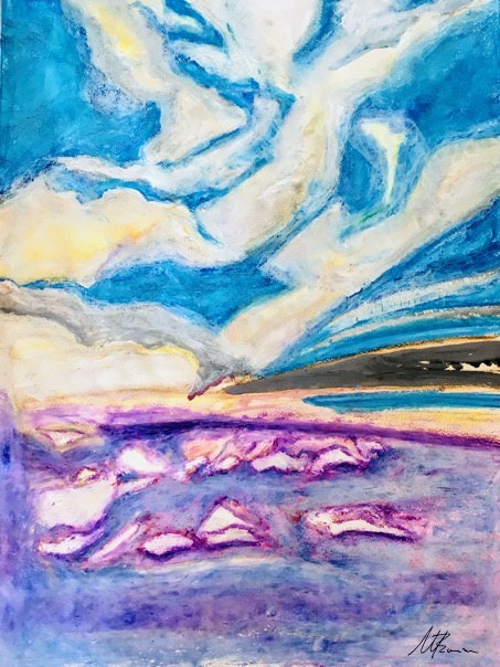 ©️ 2019, M.Thomson, Aerial Clouds Another Perspective,Oil Pastel and Watercolour on paper 19.68 H x 13.77 W (50 x 35 cm)