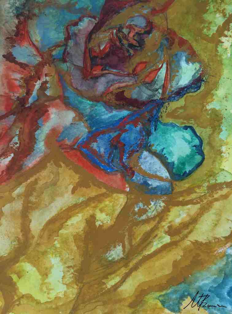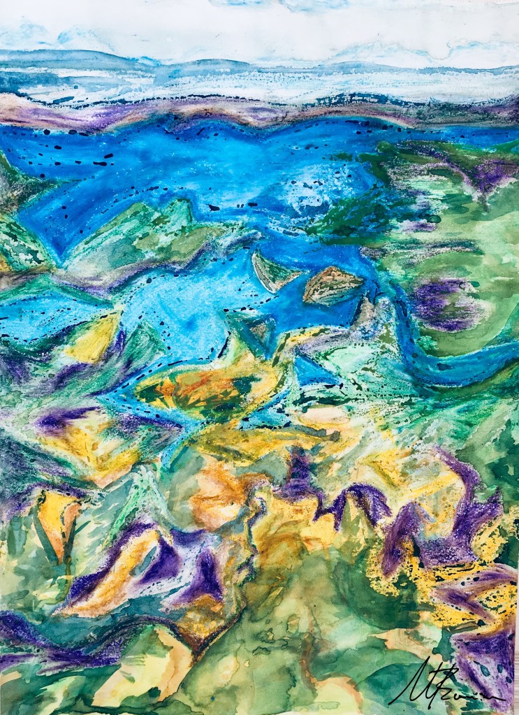 ©️ 2015, M.Thomson, Aerial Scapes of the Mind, Watercolour, Wax Pastel on paper 16.5 H x 11.7 W in (42 x 29.7 cm)