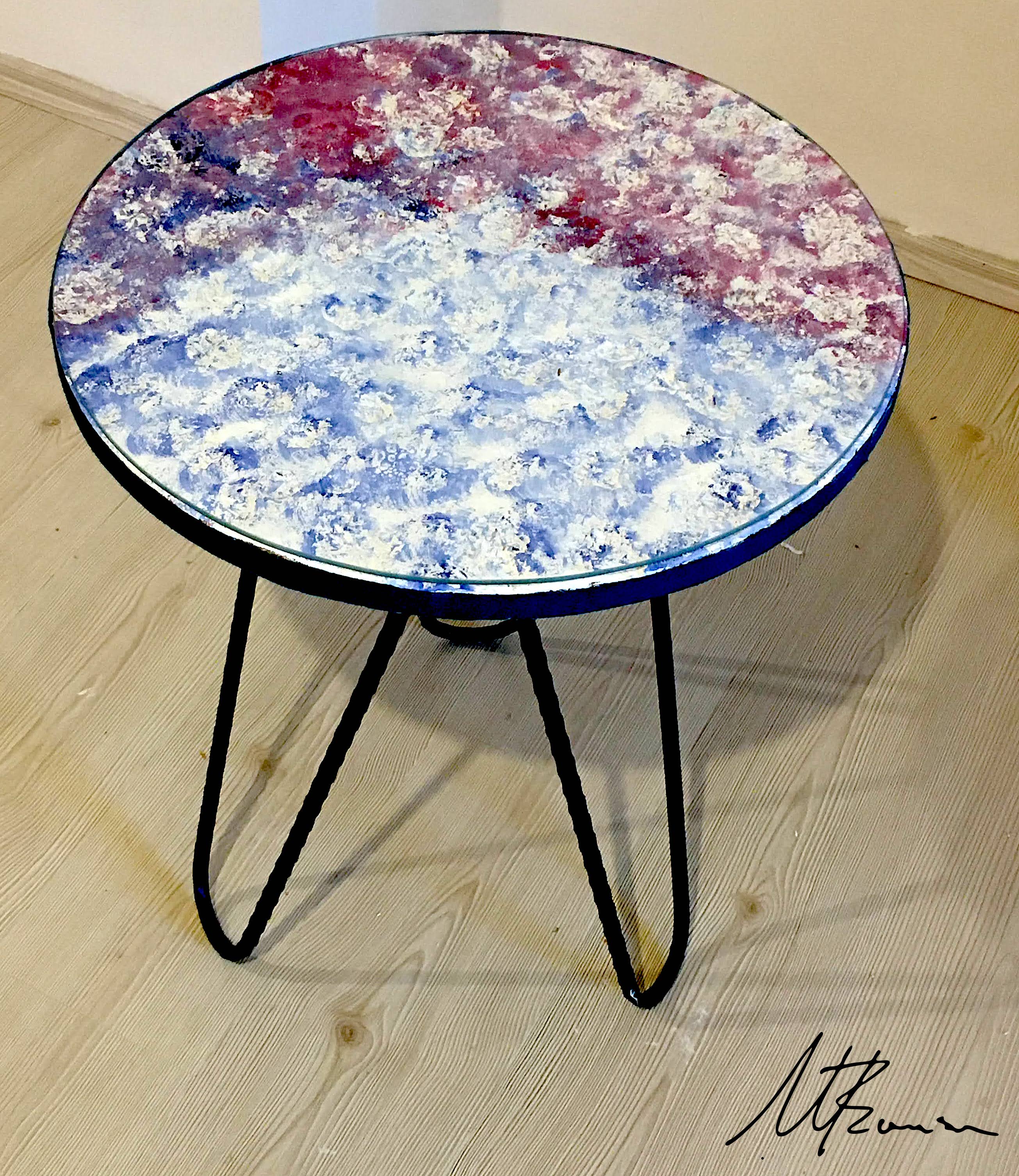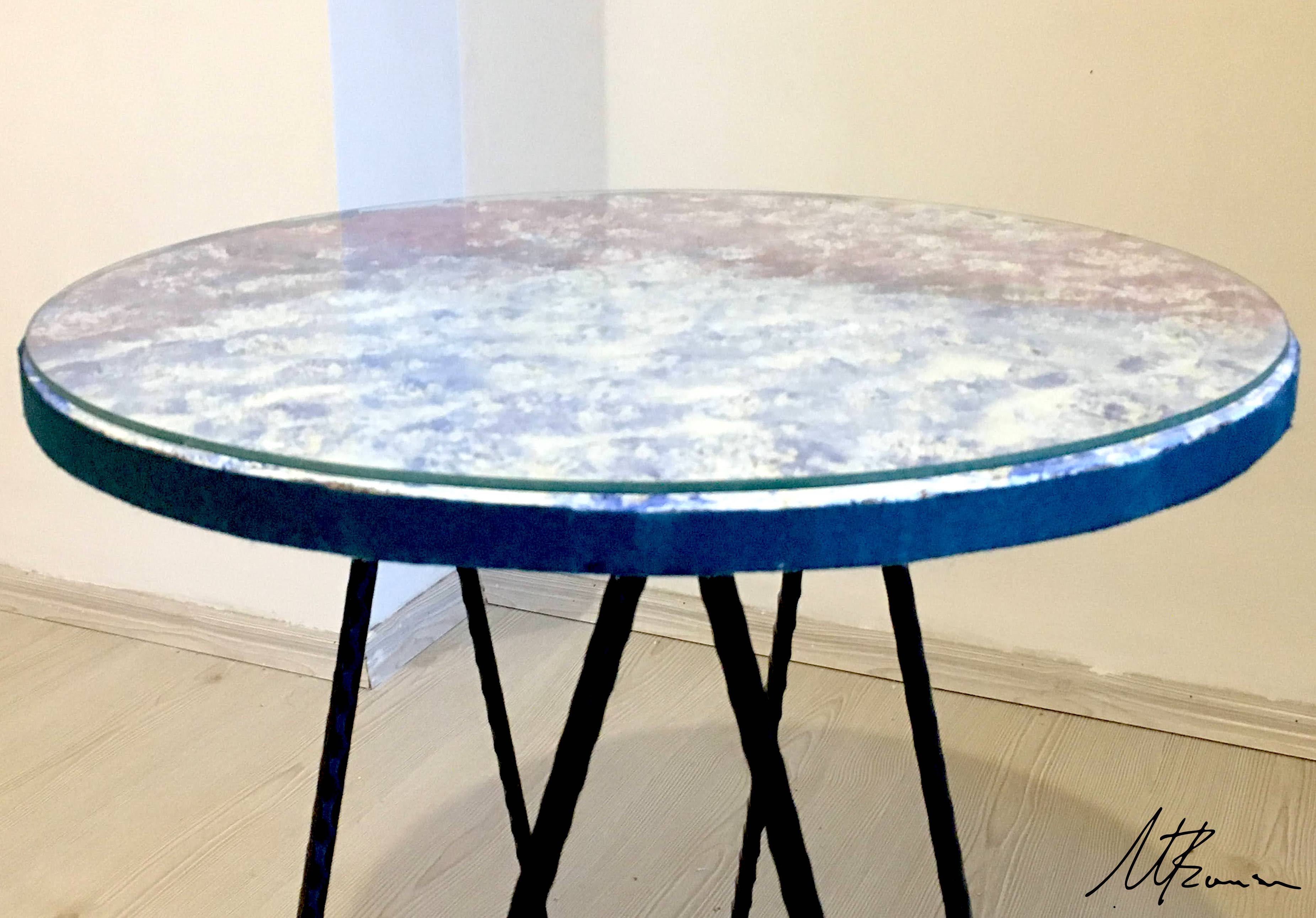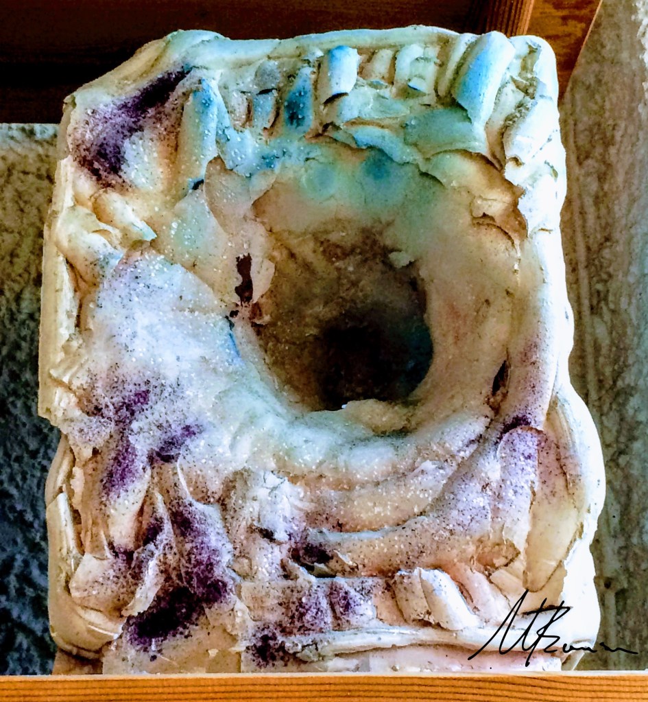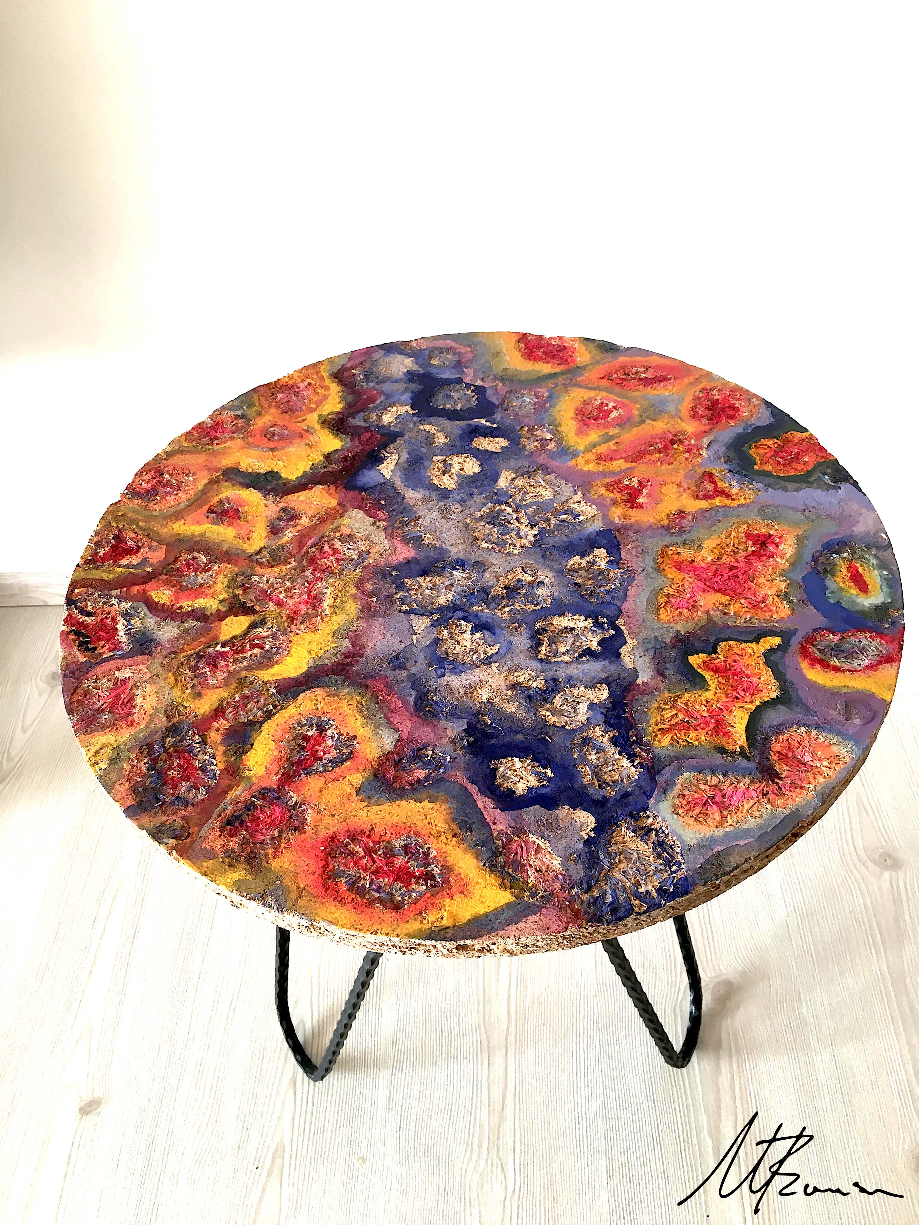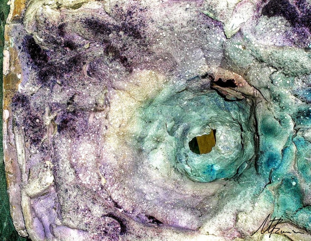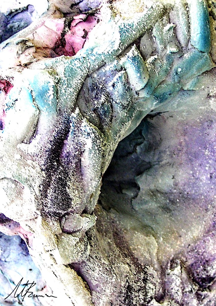 During 2019 – 2020 at our home in Turkey I began experimenting again with the textural surfaces inspired by geological rock forms. The other piece is inspired by the reflective pigment similar to a rainbow you can sometimes see in spilt petrol on the concrete aesthetically beautiful in some ways but hazardous to the environment.